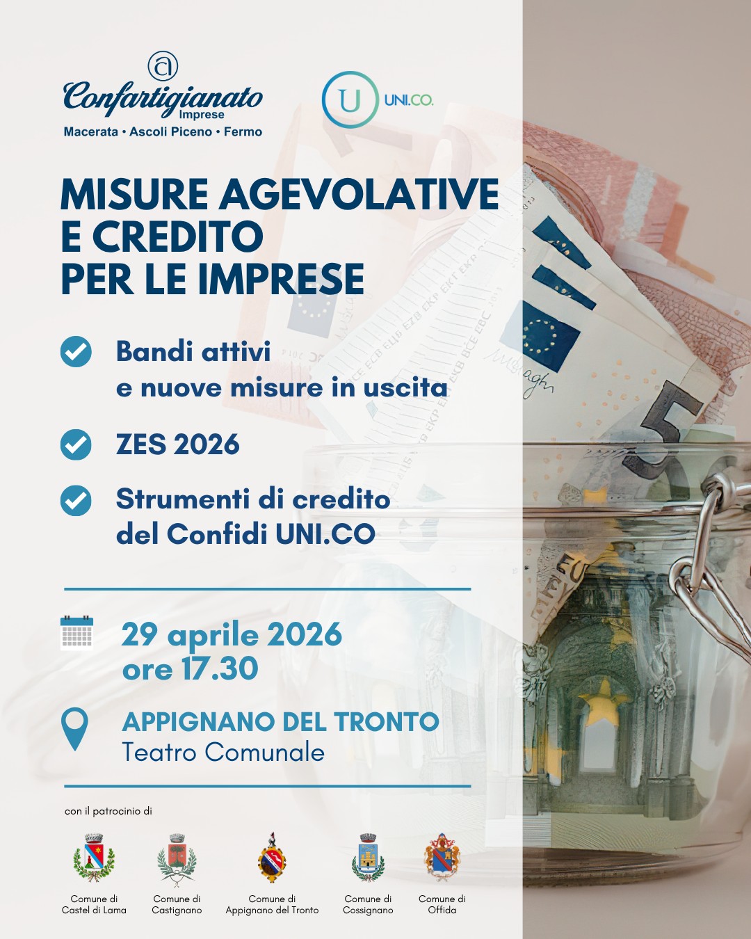 Mercoledì 29 aprile 2026 alle ore 17.30 presso il Teatro comunale di Appignano del Tronto (via Roma 146) si terrà un incontro sulle “Misure agevolate e credito per le imprese”
